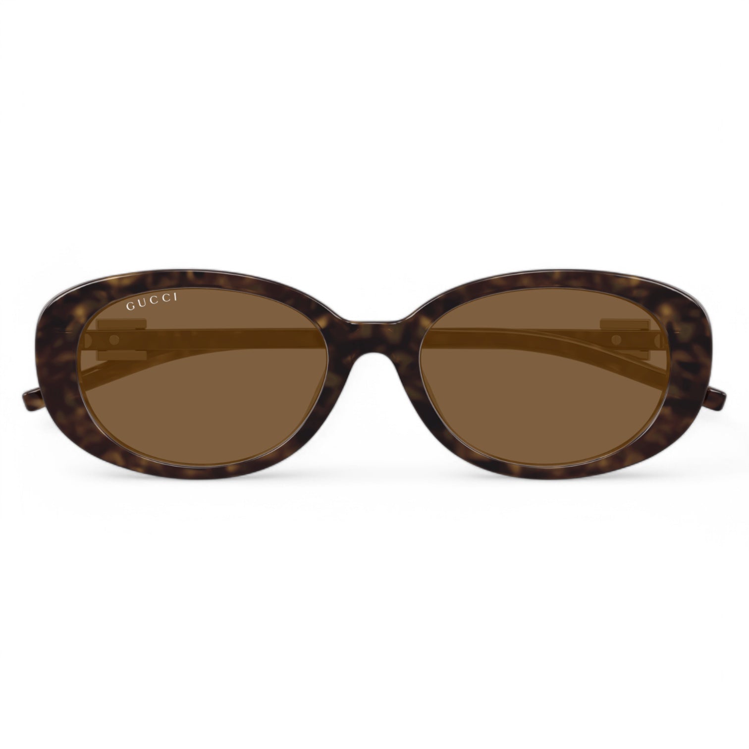 Formas estrechas de plástico con estética de los noventa adornadas con un solo logotipo G Squared en la varilla. Forma ovalada de ojos de gato inspirada en los noventa. Estructura inyectada con las varillas adornadas con un logotipo G Squared en metal. Paleta de colores lisos y femeninos que se complementa con logotipos únicos con estrás.