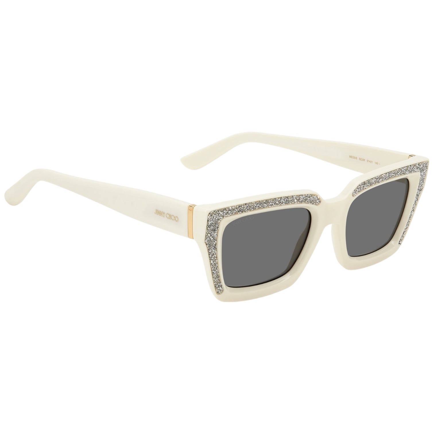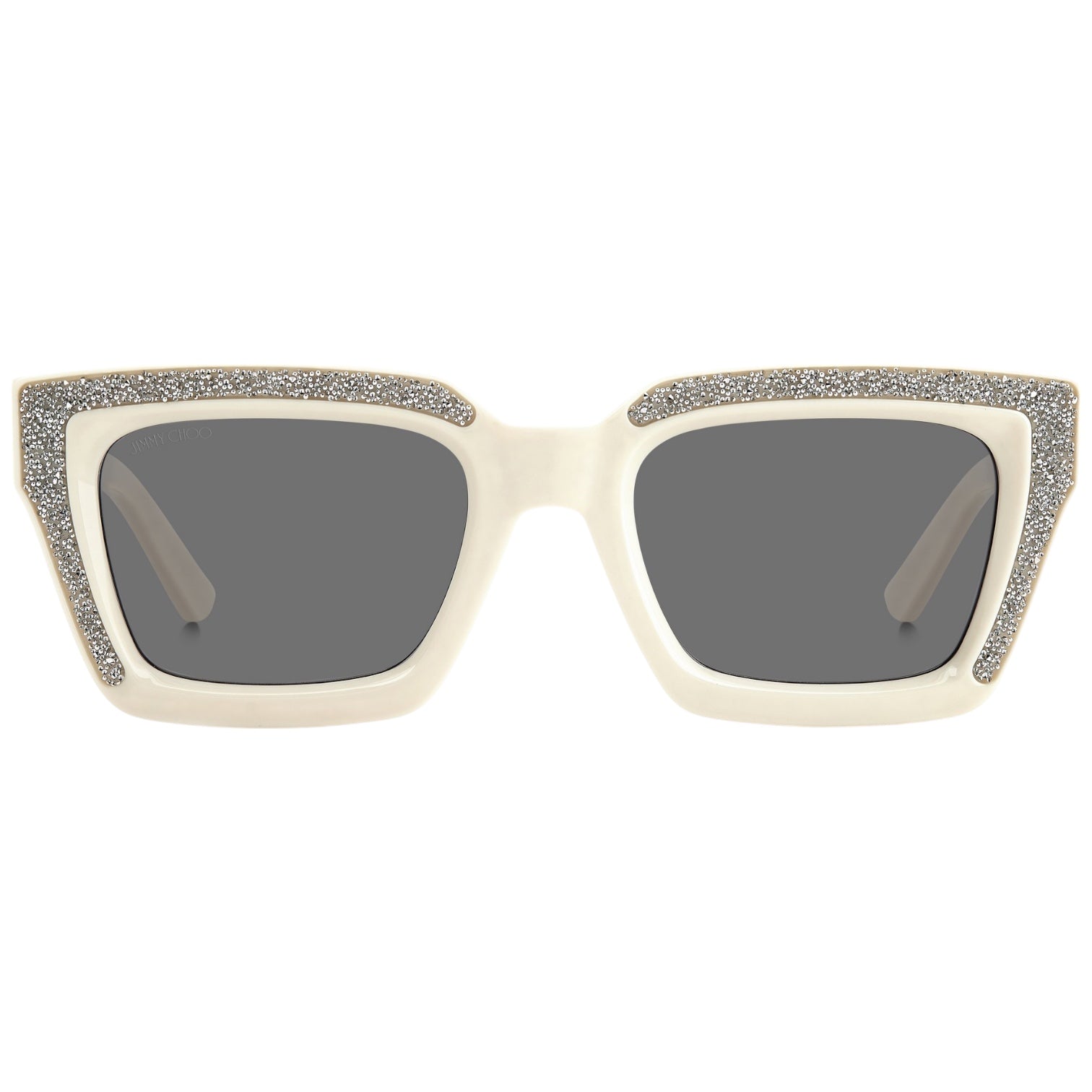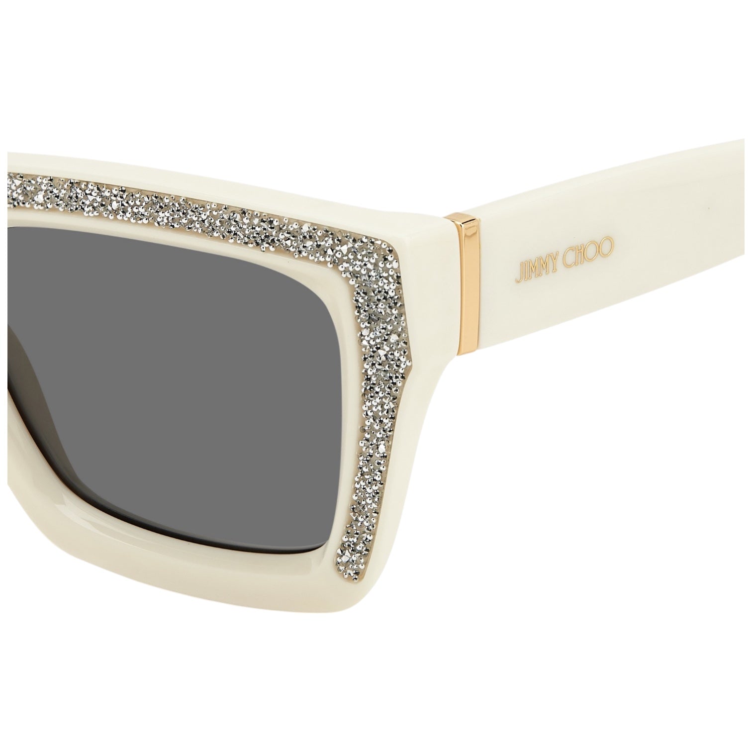 Estas gafas de sol rectangulares presentan una montura de acetato en tono marfil, adornada con detalles de glitter plateado en el frontal y varillas. Las lentes grises ofrecen protección UV400, combinando funcionalidad y estilo en un diseño llamativo y femenino.