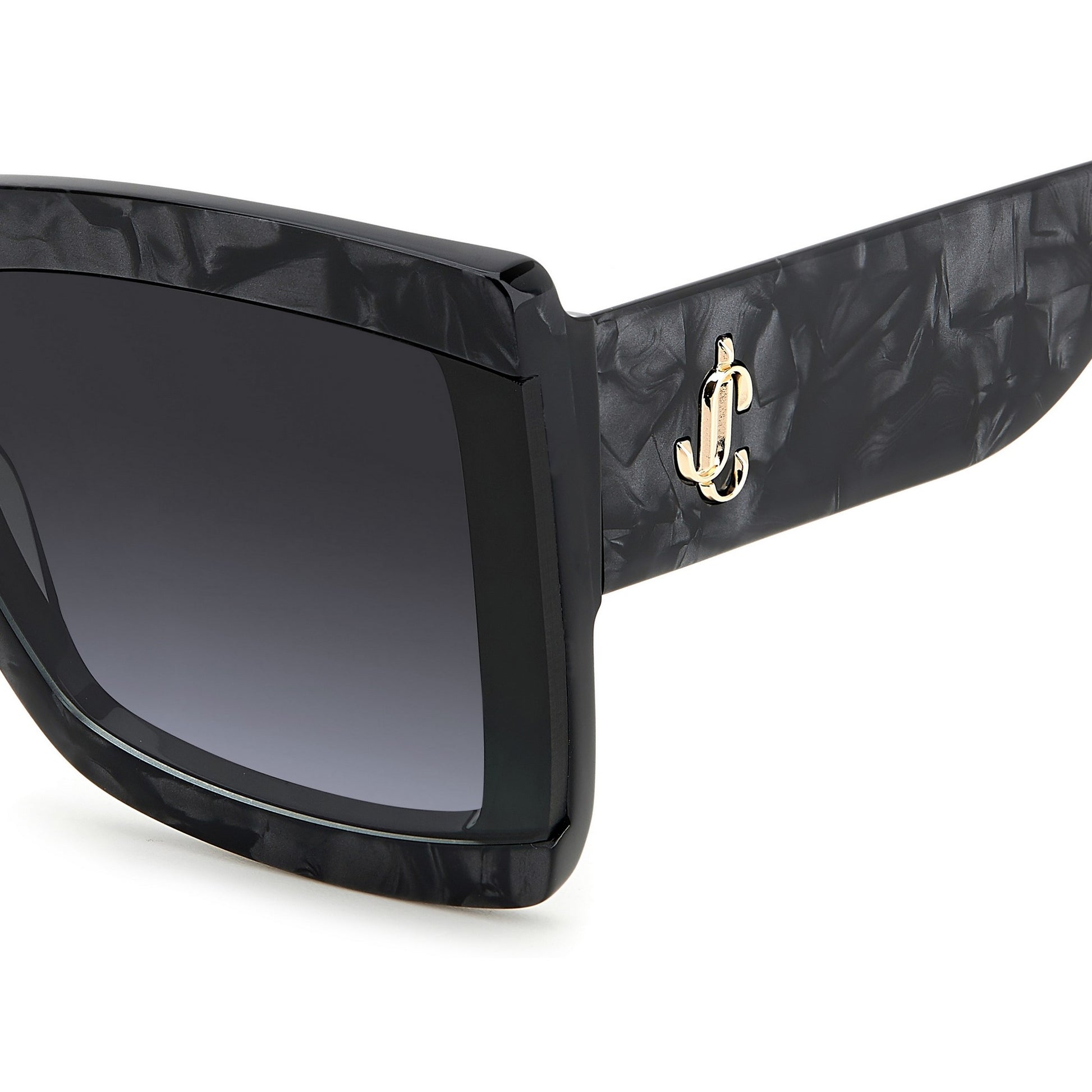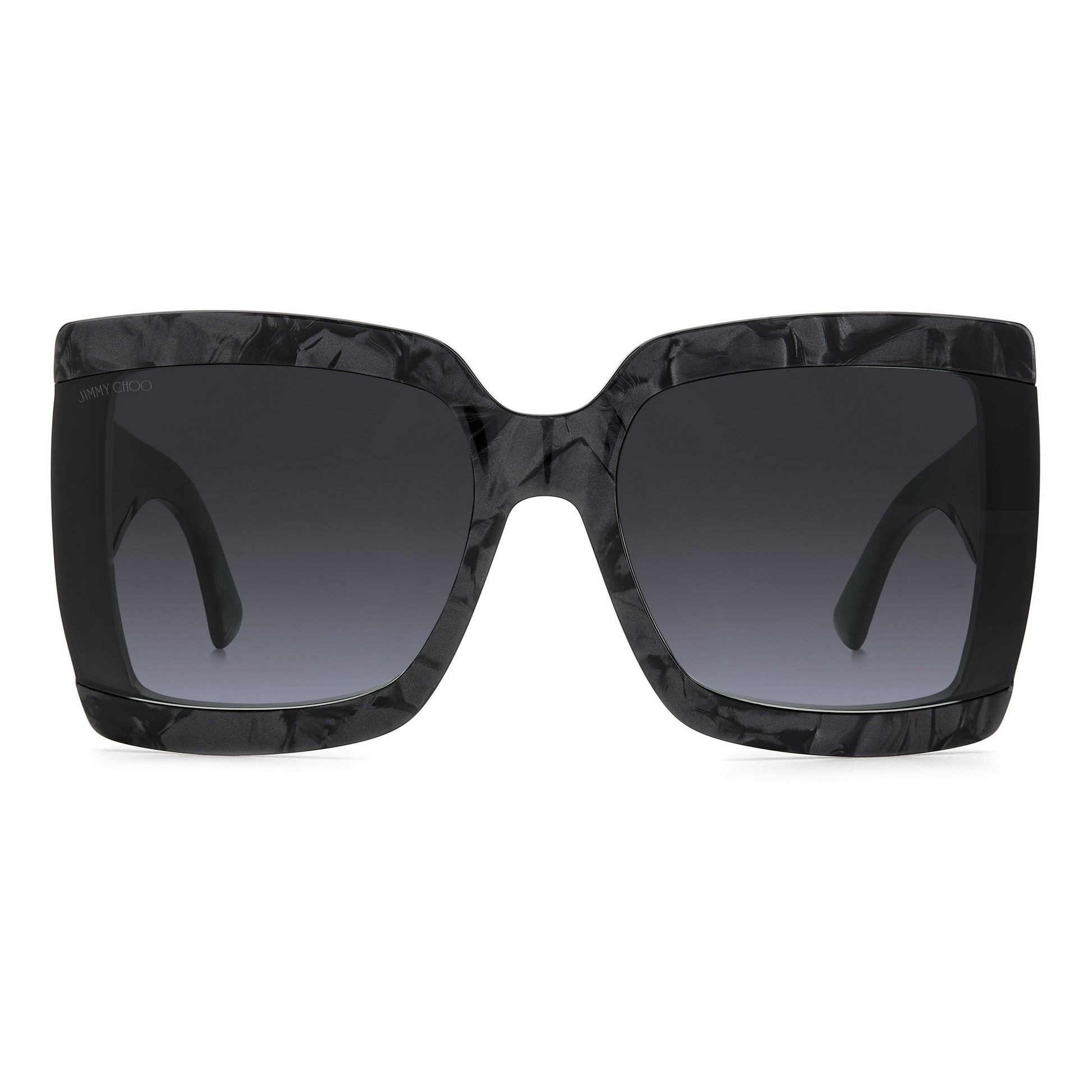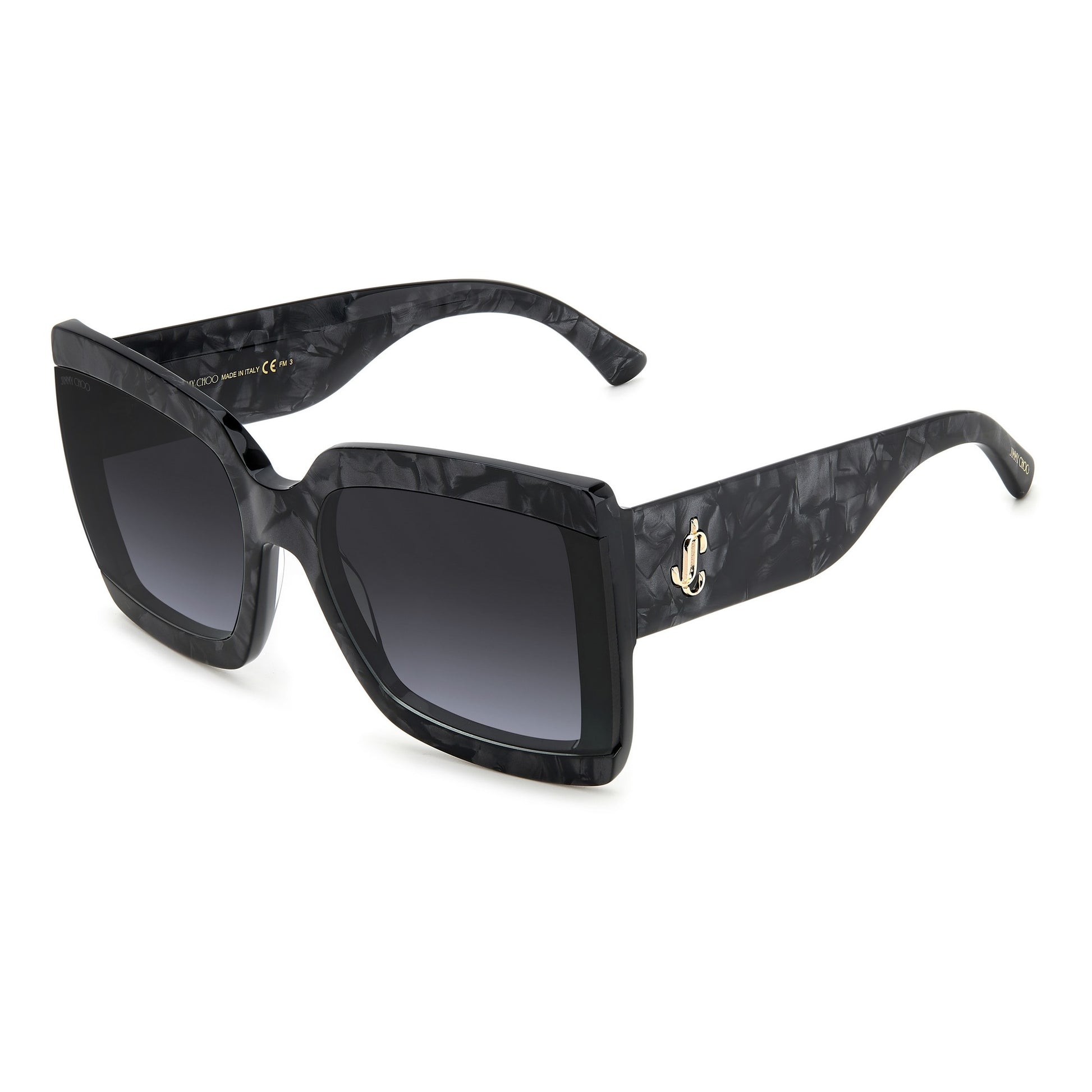 Gafas de sol femeninas con montura cuadrada oversize en acetato gris nácar y lentes degradadas en gris oscuro. Destacan por su diseño elegante y moderno, con detalles metálicos del logotipo JC en las varillas. Ideales para quienes buscan un accesorio sofisticado que combine estilo y funcionalidad.