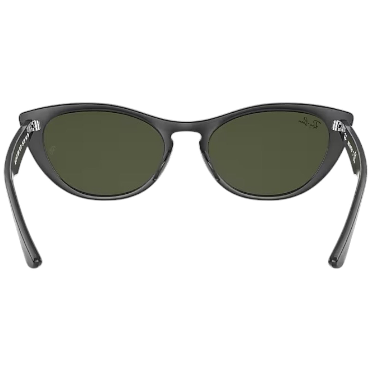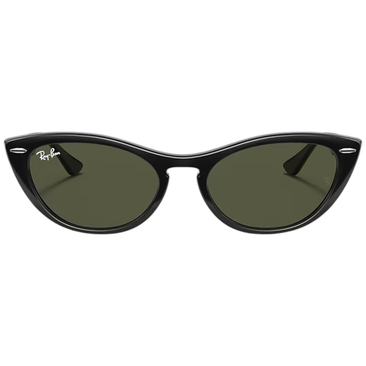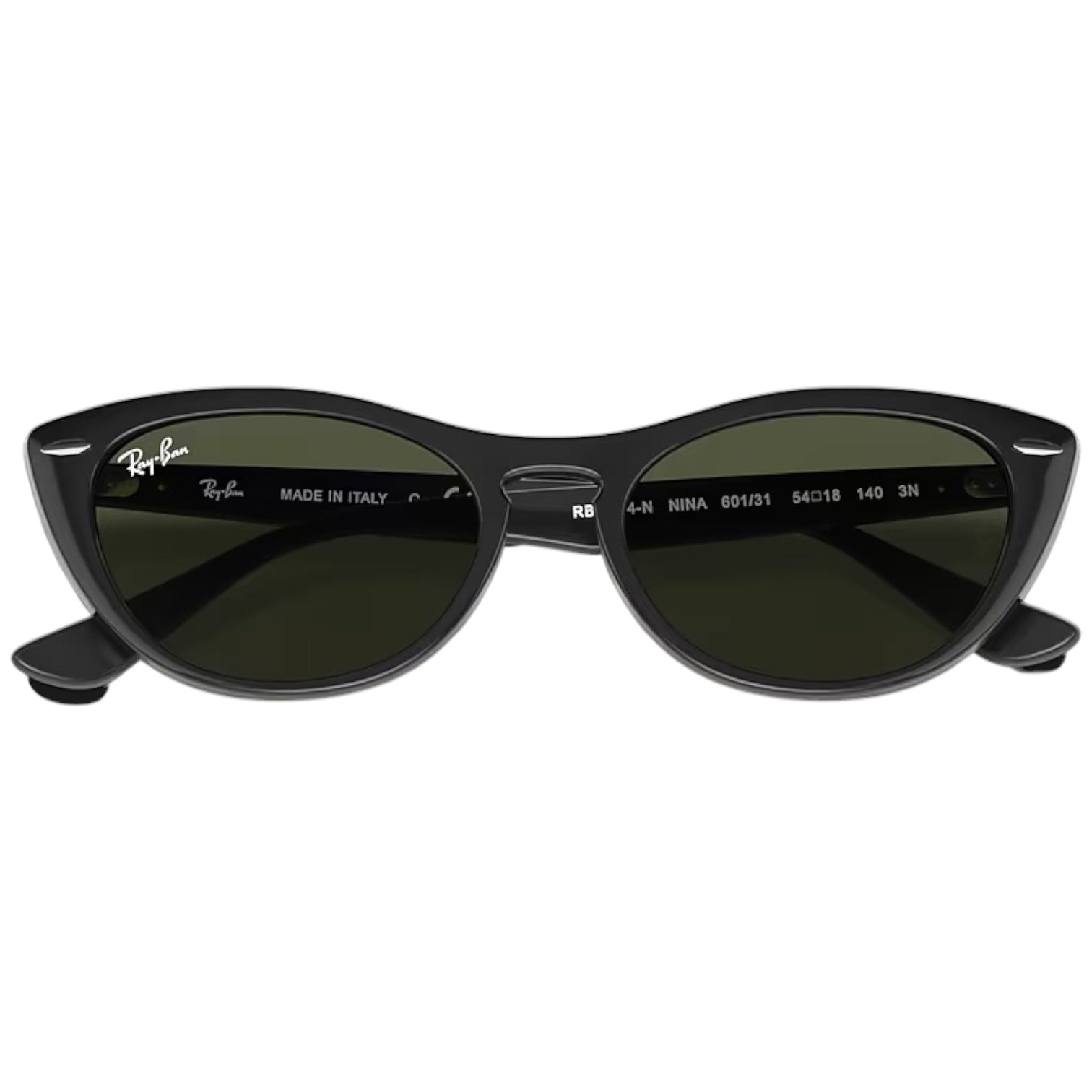 Las Ray-Ban Nina presentan una silueta cat-eye con un diseño elegante y atemporal. Su montura negra de acetato y lentes verdes G-15 ofrecen un estilo sofisticado y una protección solar eficaz. Un modelo que combina feminidad y carácter, ideal para quienes buscan destacar con sofisticación