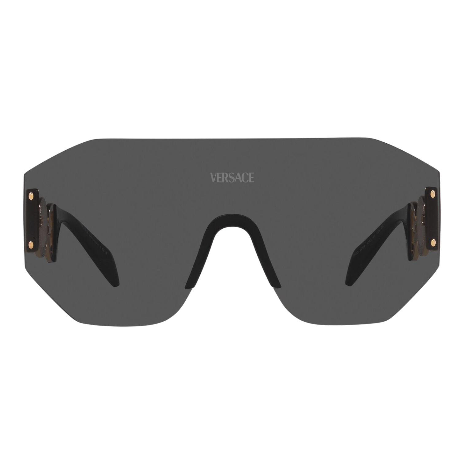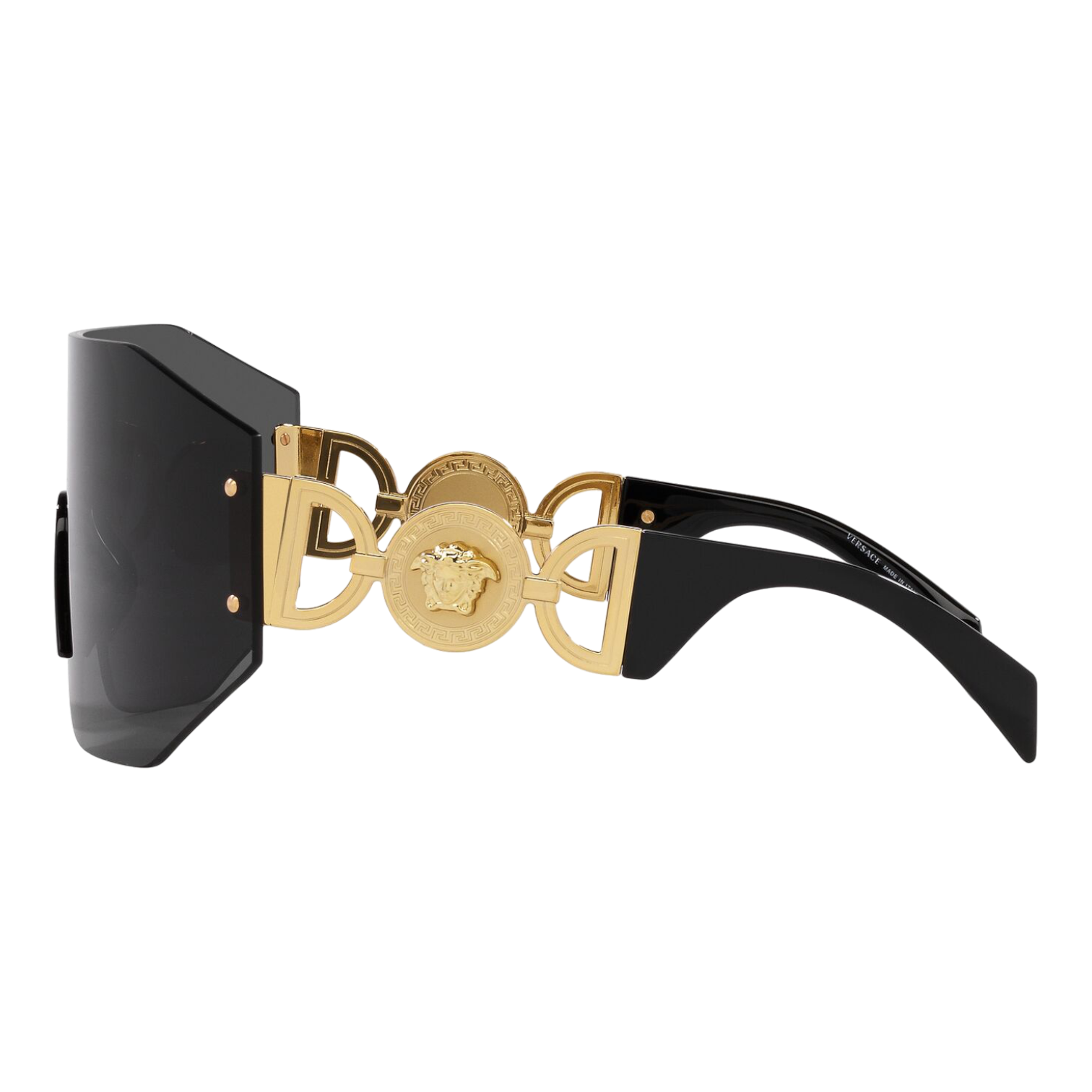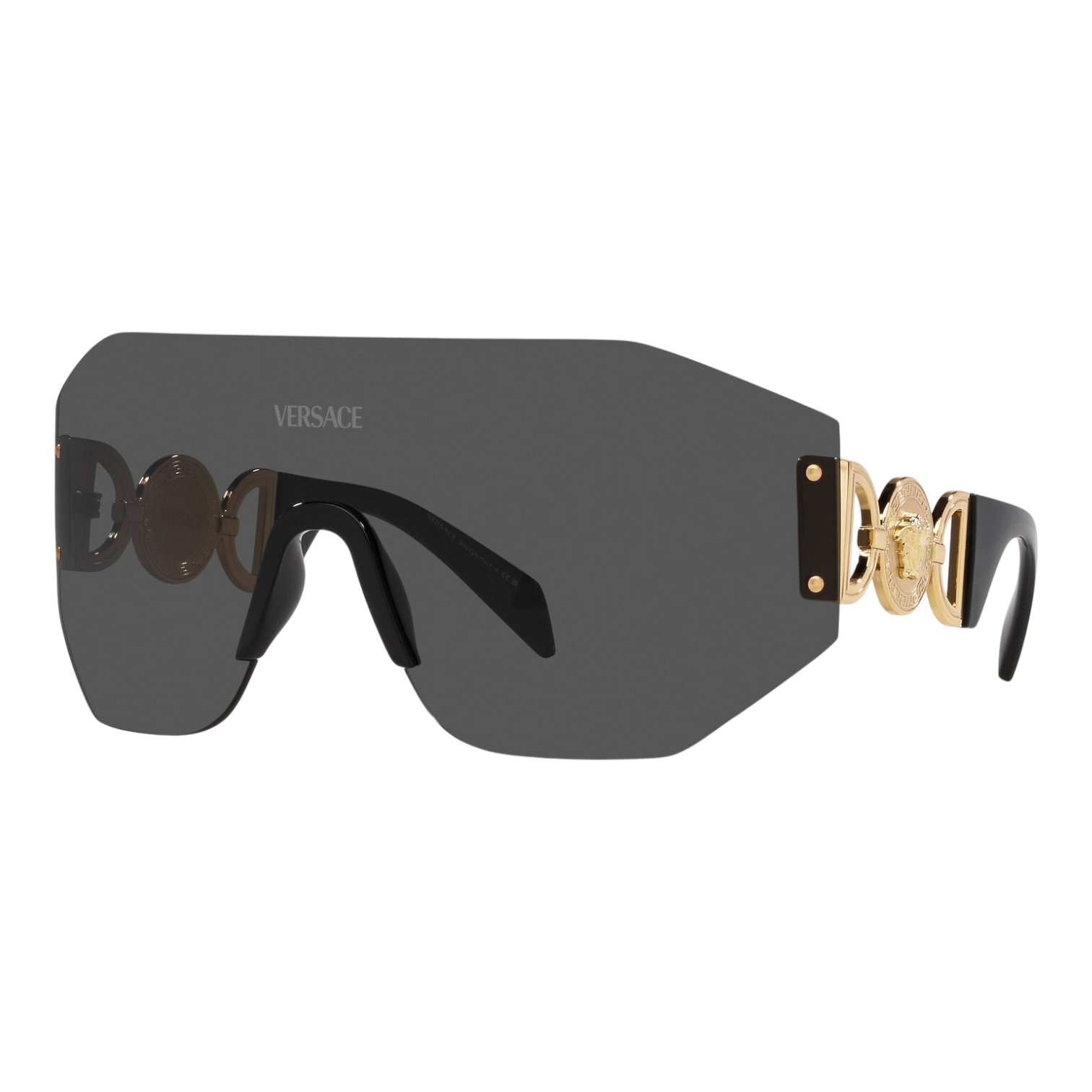 Las gafas de sol Versace VE 2258 1002/87 presentan una montura de acetato negro con detalles metálicos dorados, combinando un diseño de máscara futurista con una estructura metálica semi-rimless. Las lentes en tono gris oscuro ofrecen una apariencia sofisticada y proporcionan una protección adecuada contra la luz solar intensa