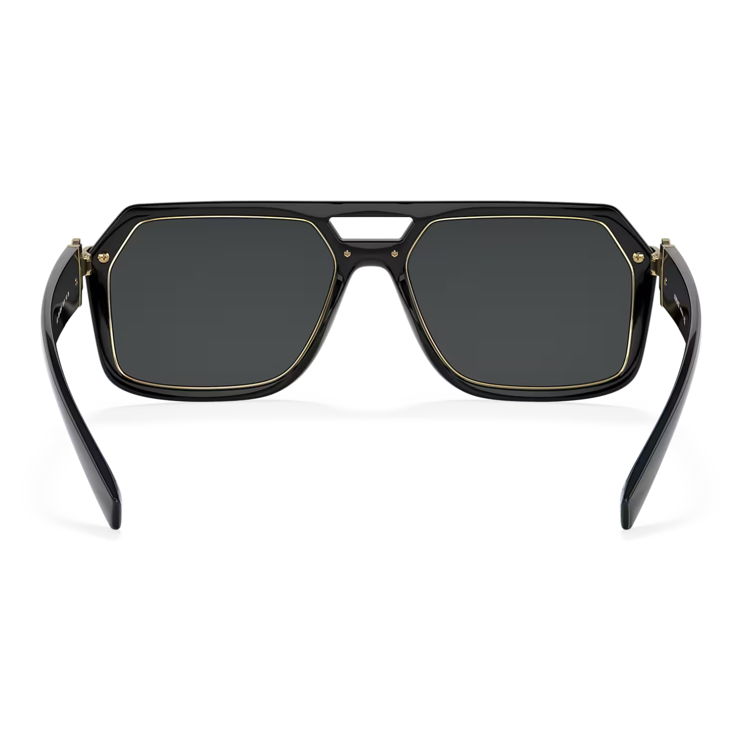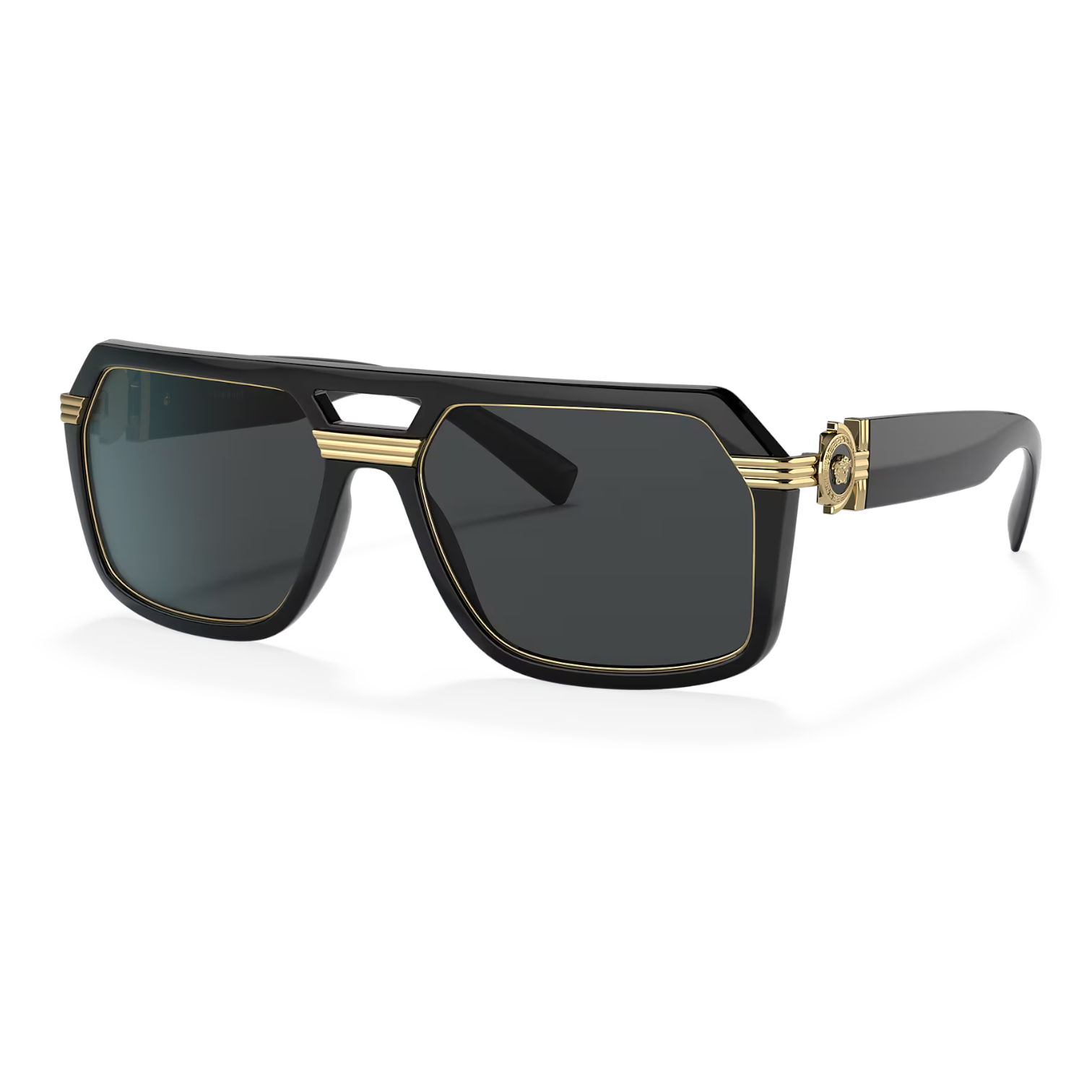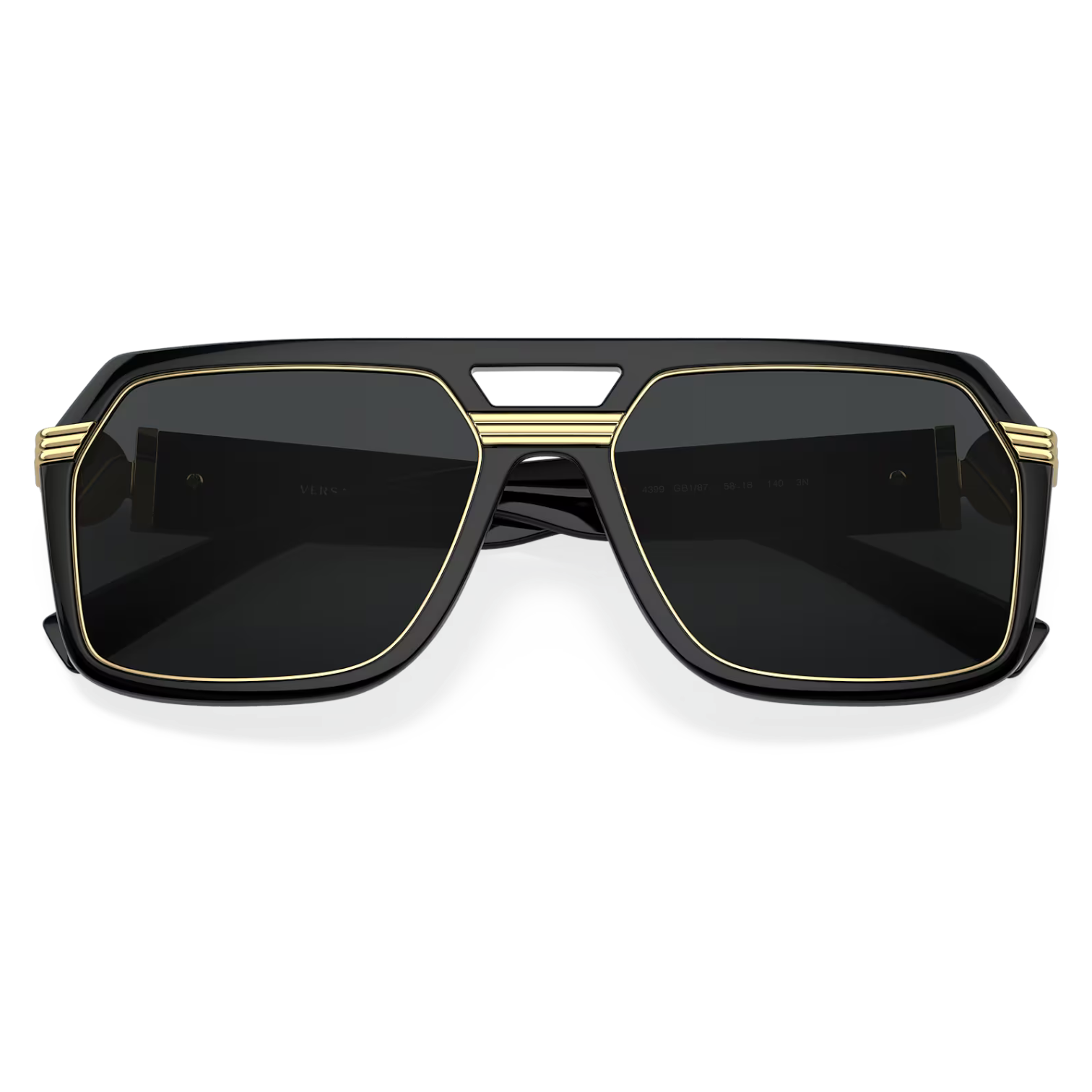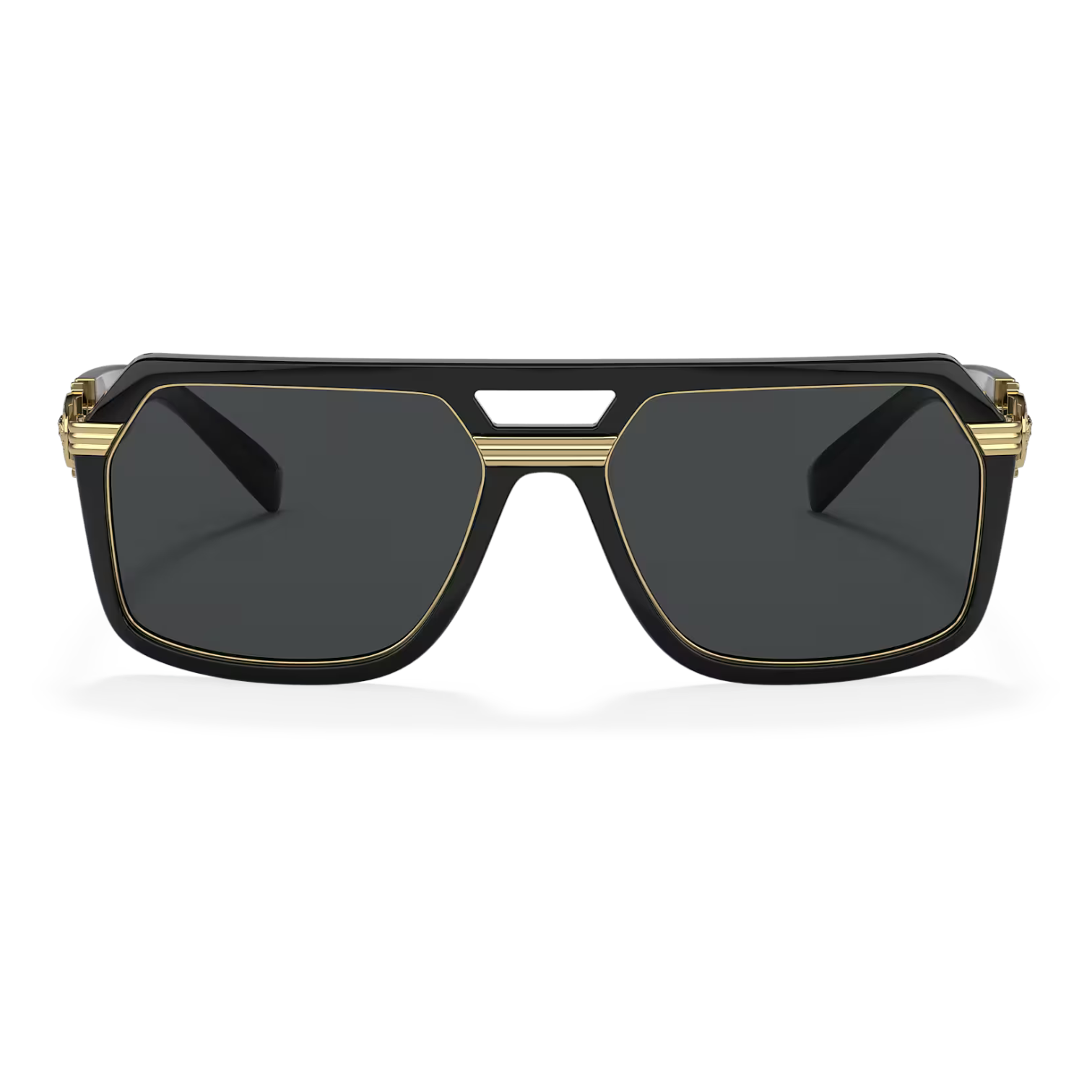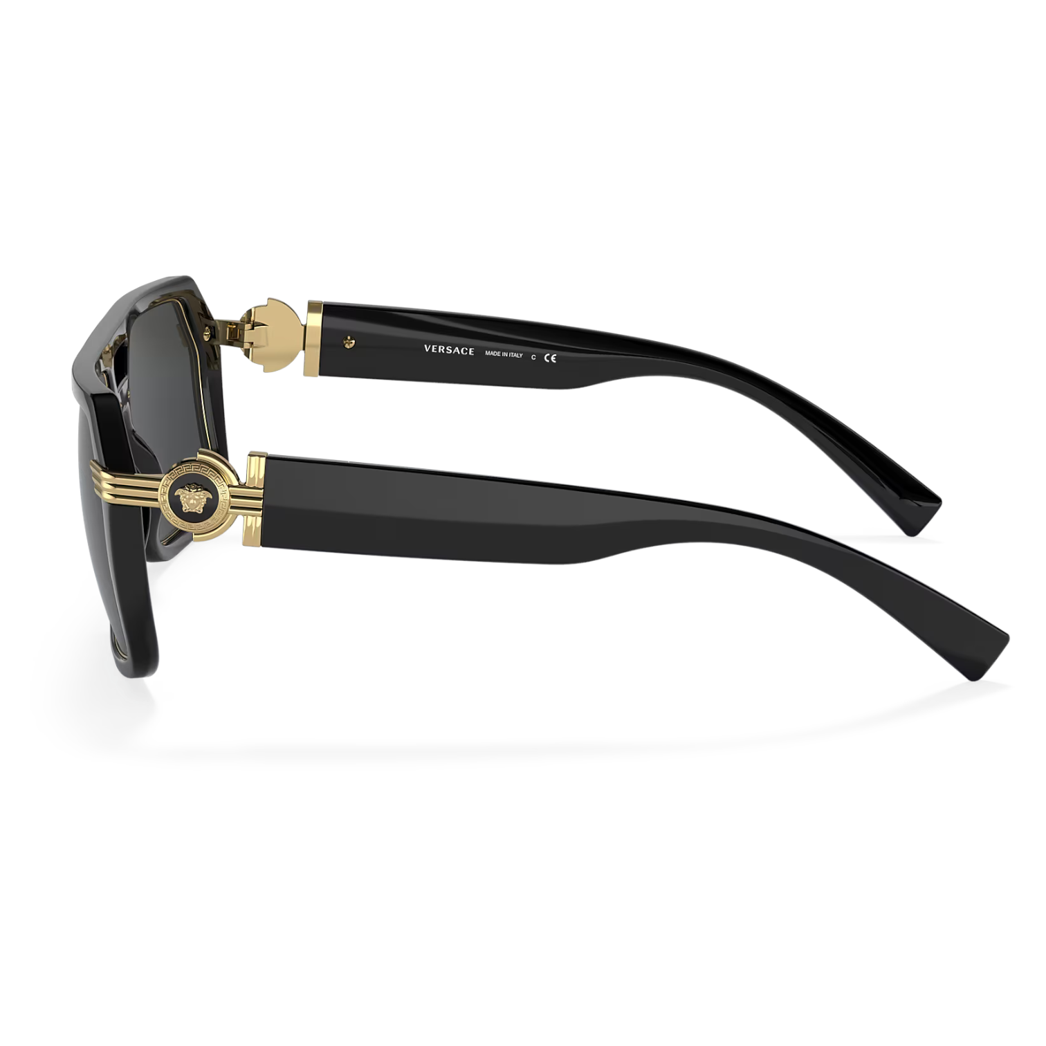 Las gafas de sol Versace VE 4399 en el color GB1/87 presentan una elegante montura de acetato negro, destacándose por su diseño rectangular que combina sofisticación y estilo. Las lentes en tono gris completan un look refinado, mientras que su forma clásica las hace perfectas para cualquier ocasión.