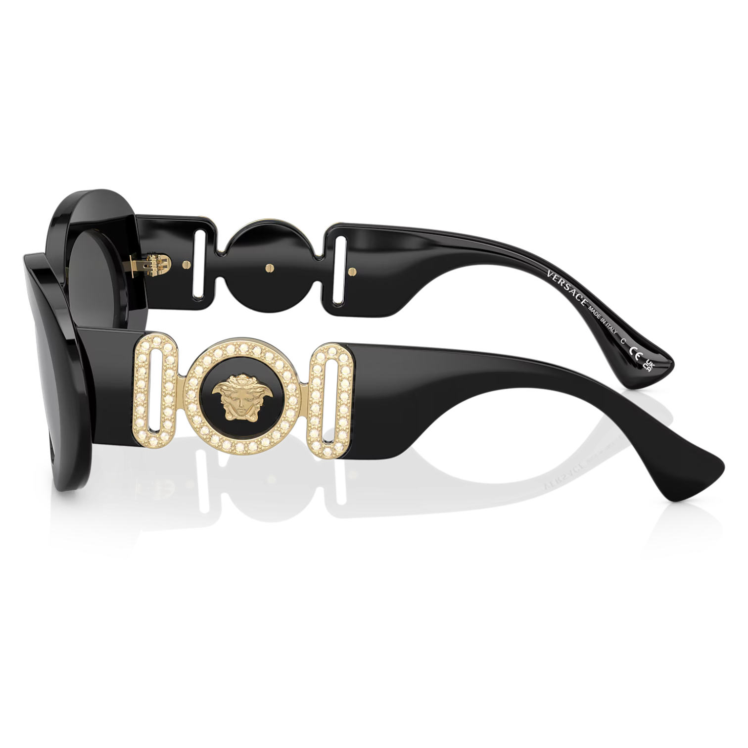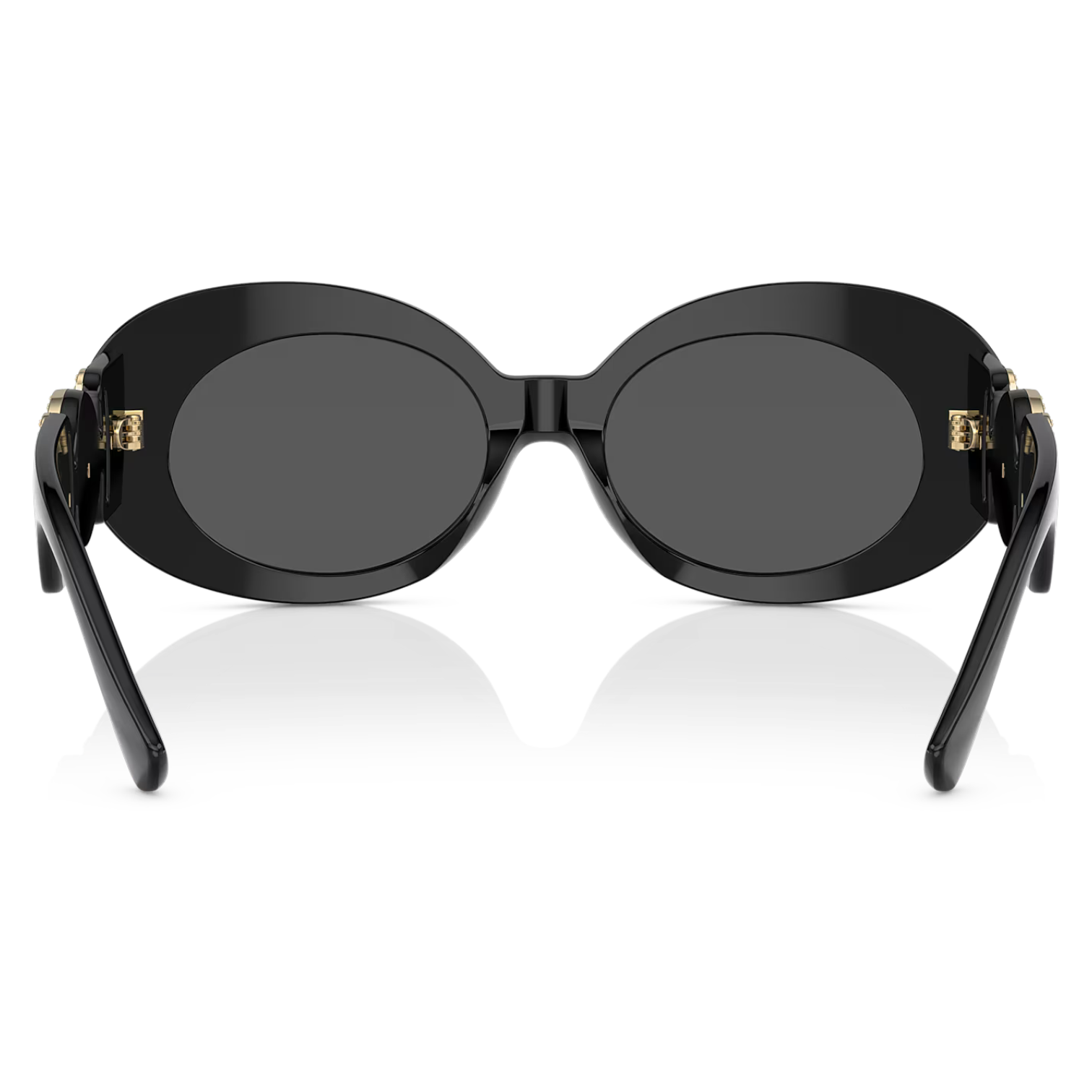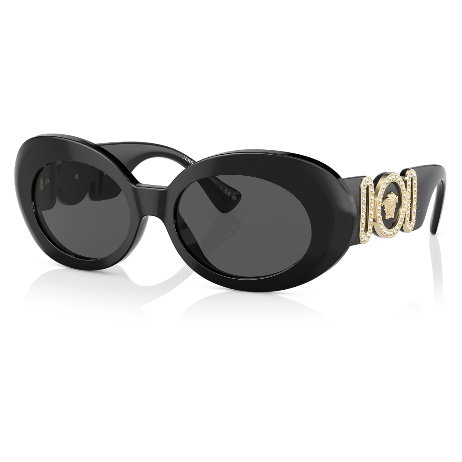 Las gafas de sol Versace VE4426BU GB1/87 destacan por su montura ovalada y elegante en color negro brillante. Las varillas, decoradas con el icónico logo de Medusa en dorado y llenos de brillantes, aportan un toque de lujo y distinción. Su estilo audaz y contemporáneo es perfecto para quienes buscan marcar tendencia con un accesorio de alta moda.