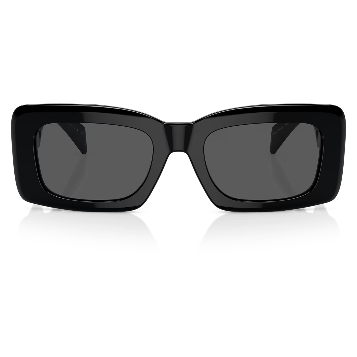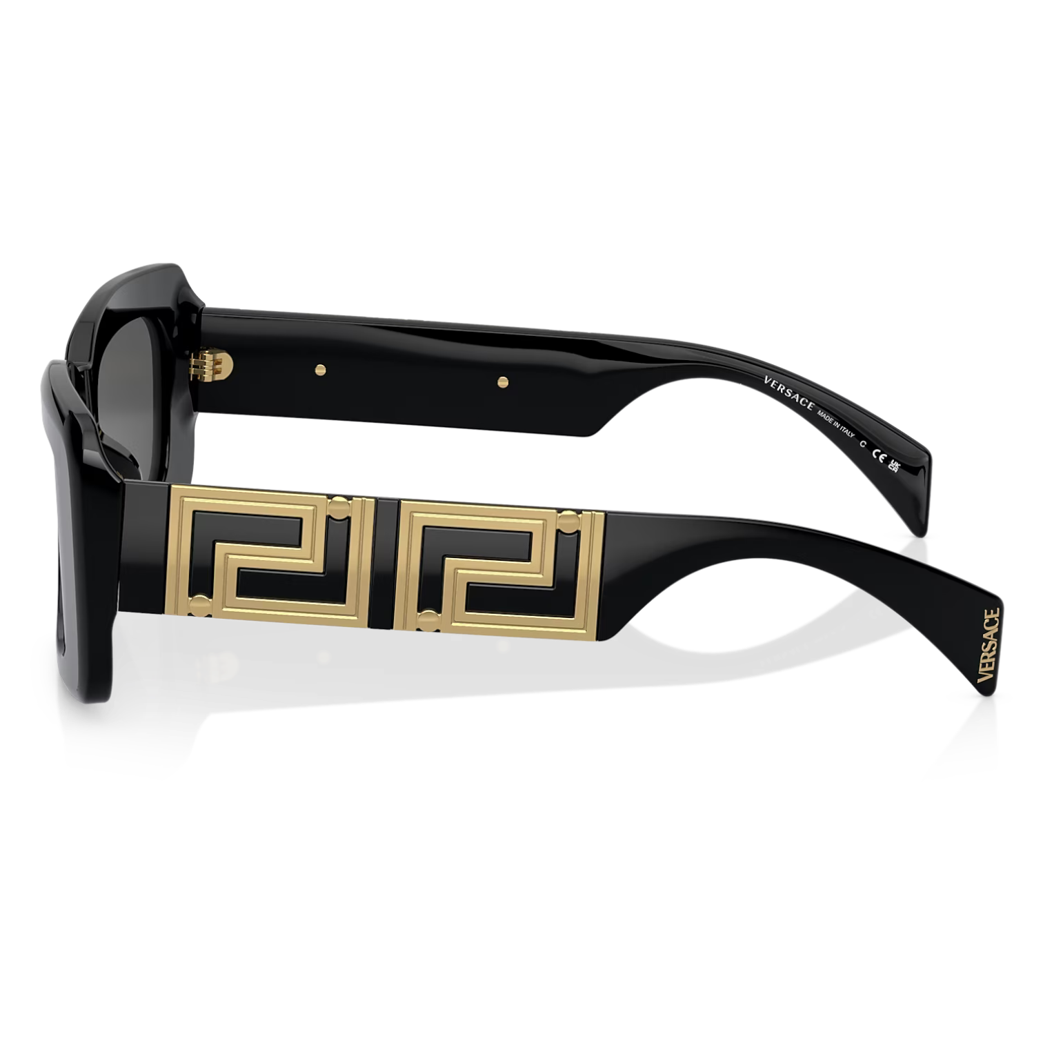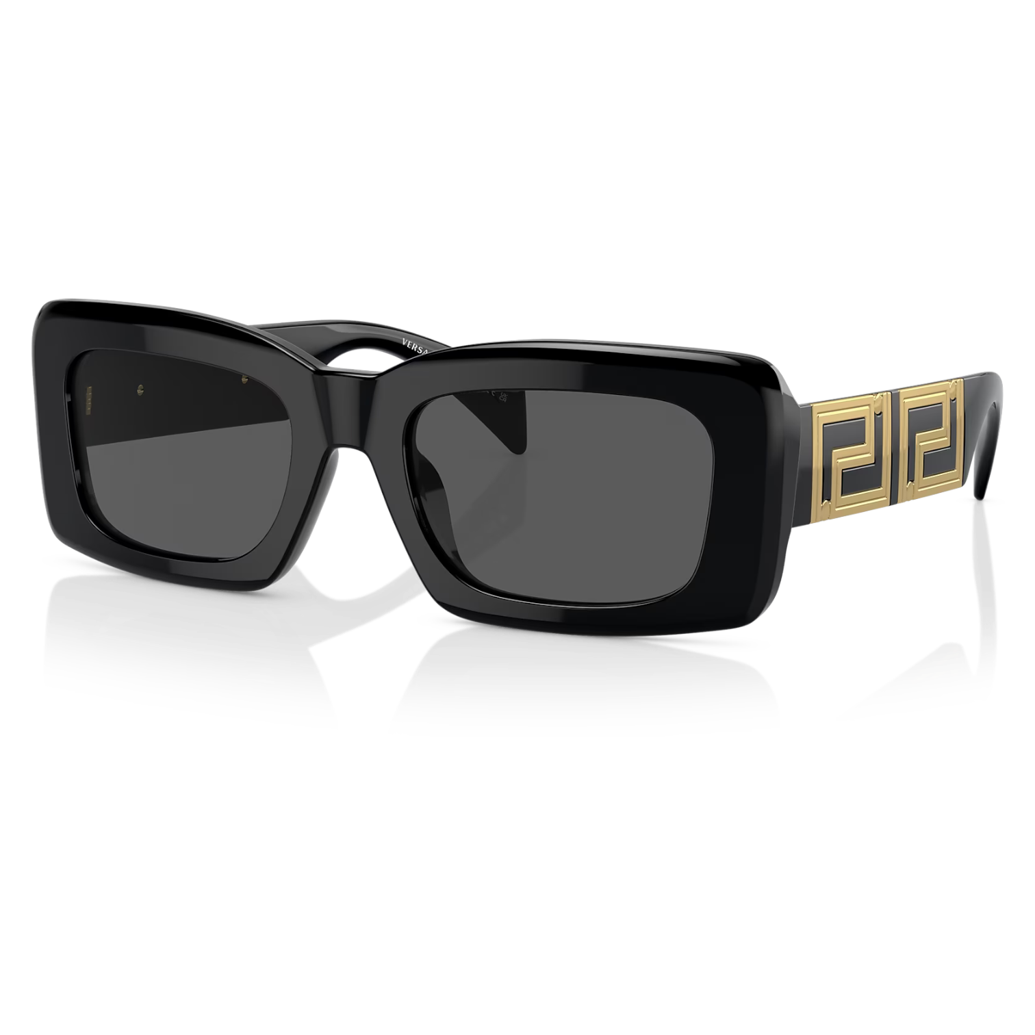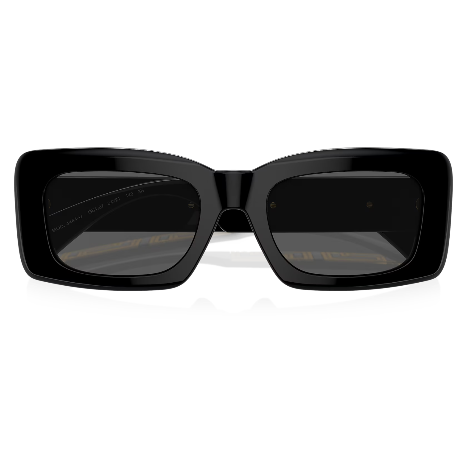 Las gafas de sol Versace VE 4444U en el color GB1/87 presentan una montura rectangular de acetato negro con detalles dorados en las varillas, reflejando el lujo característico de la marca. Las lentes de color gris oscuro ofrecen una protección eficaz contra los rayos UV, garantizando comodidad y estilo.