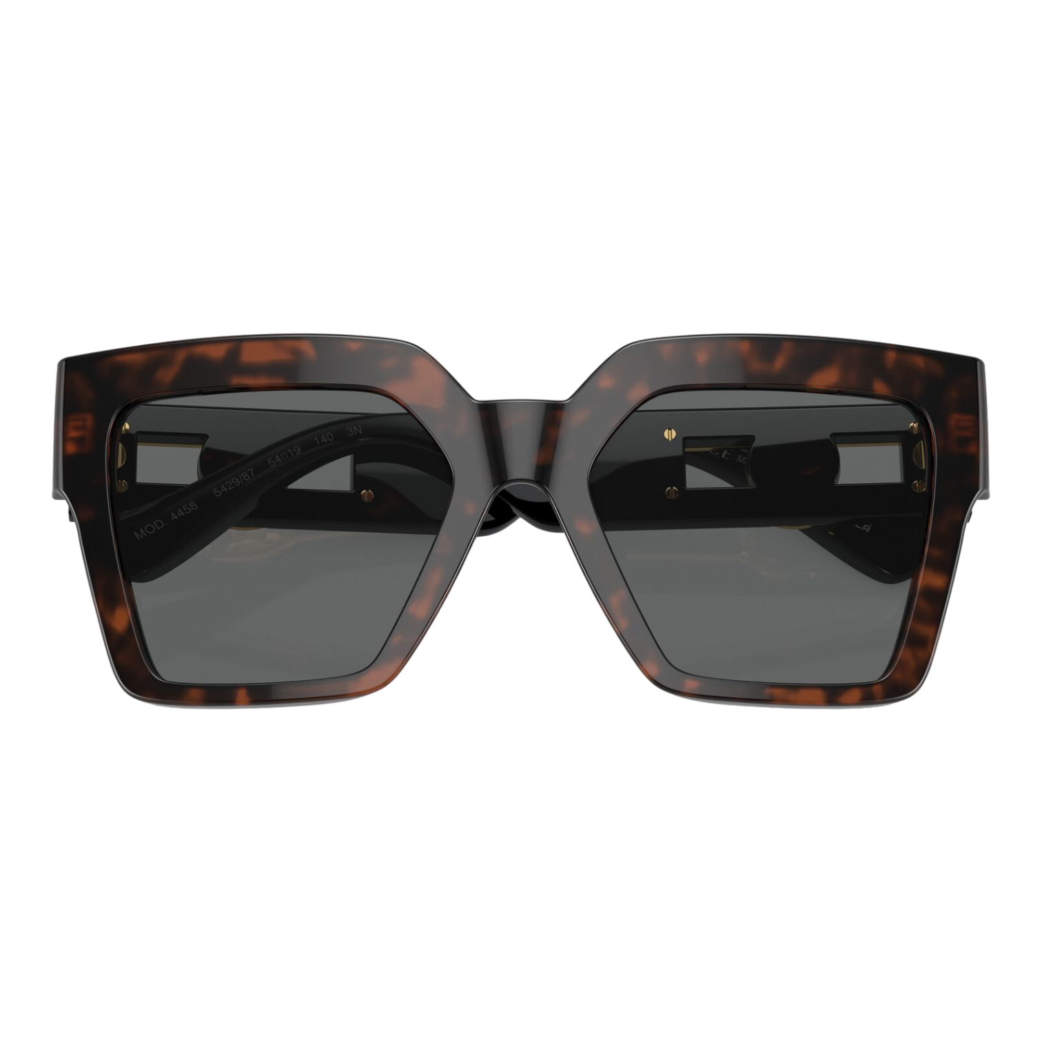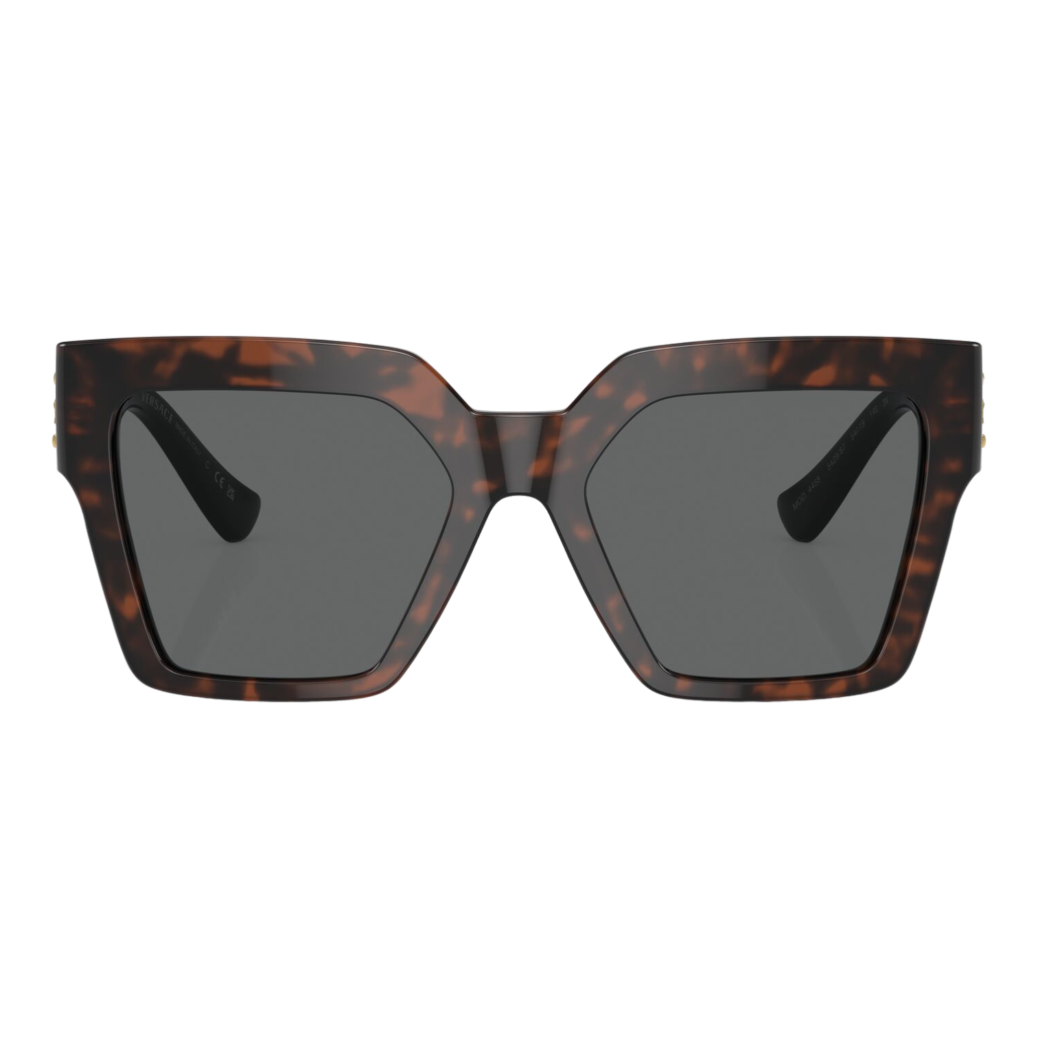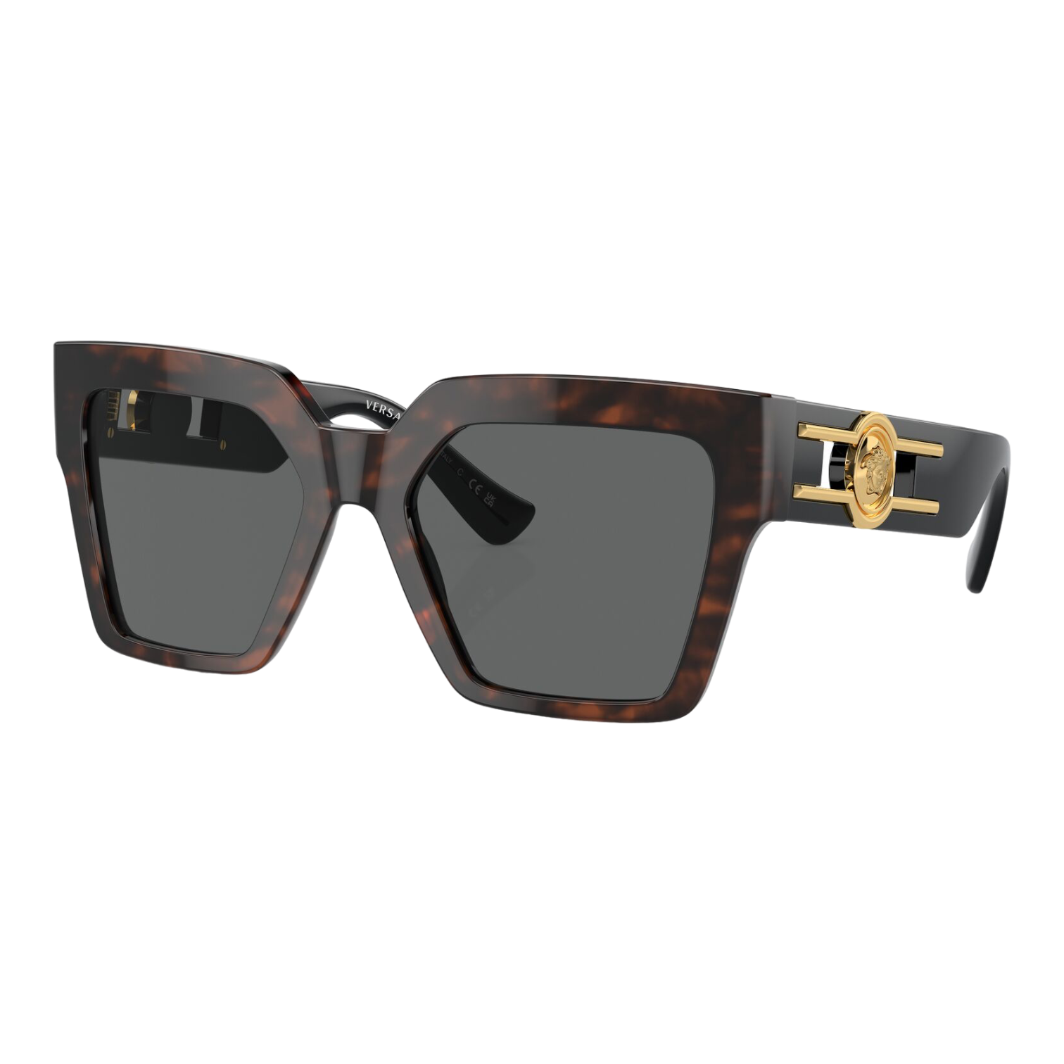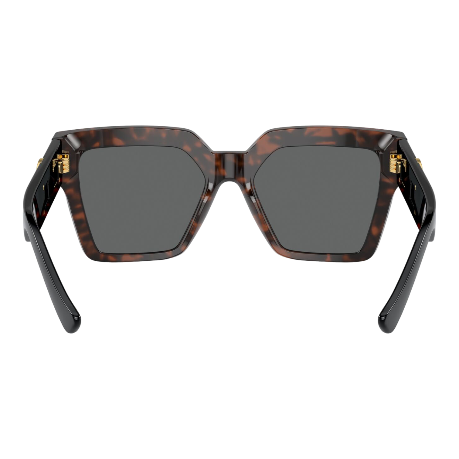 Estas gafas de sol destacan por su montura en forma de mariposa, elaborada en acetato color havana, que le da un toque sofisticado y femenino. Las varillas, adornadas con el icónico logotipo dorado de la Medusa, añaden un detalle de lujo característico de Versace. Los lentes gris oscuro ofrecen una protección UV del 100%, fusionando estilo y funcionalidad en un solo accesorio.