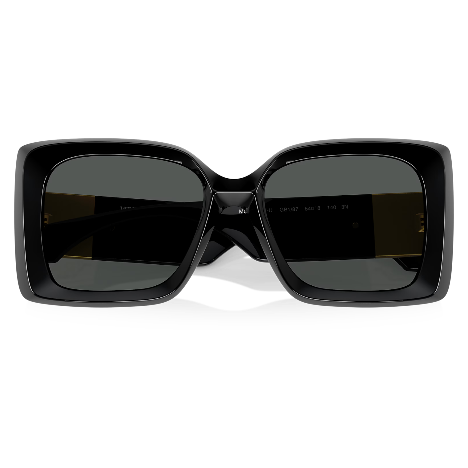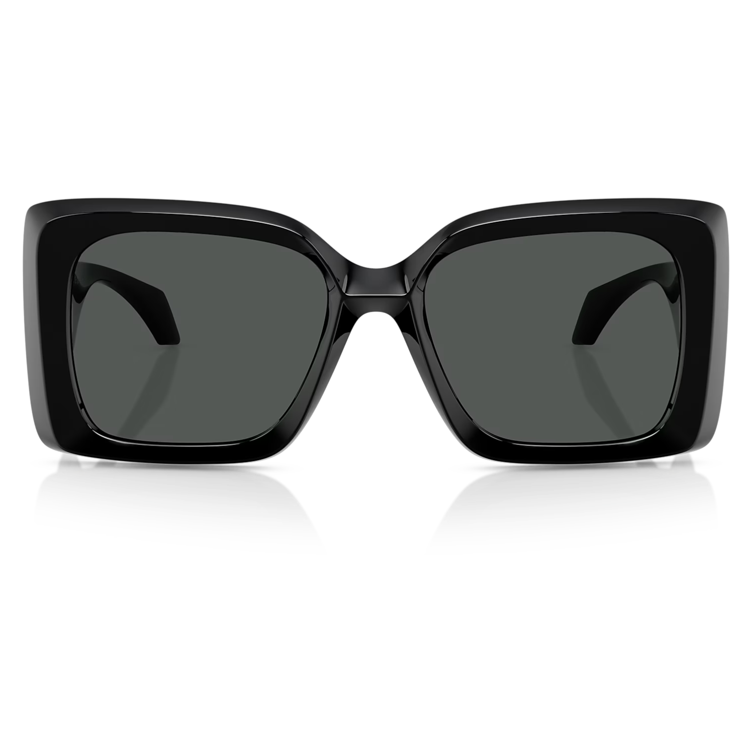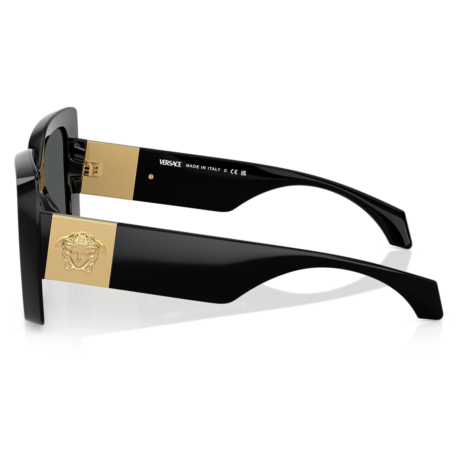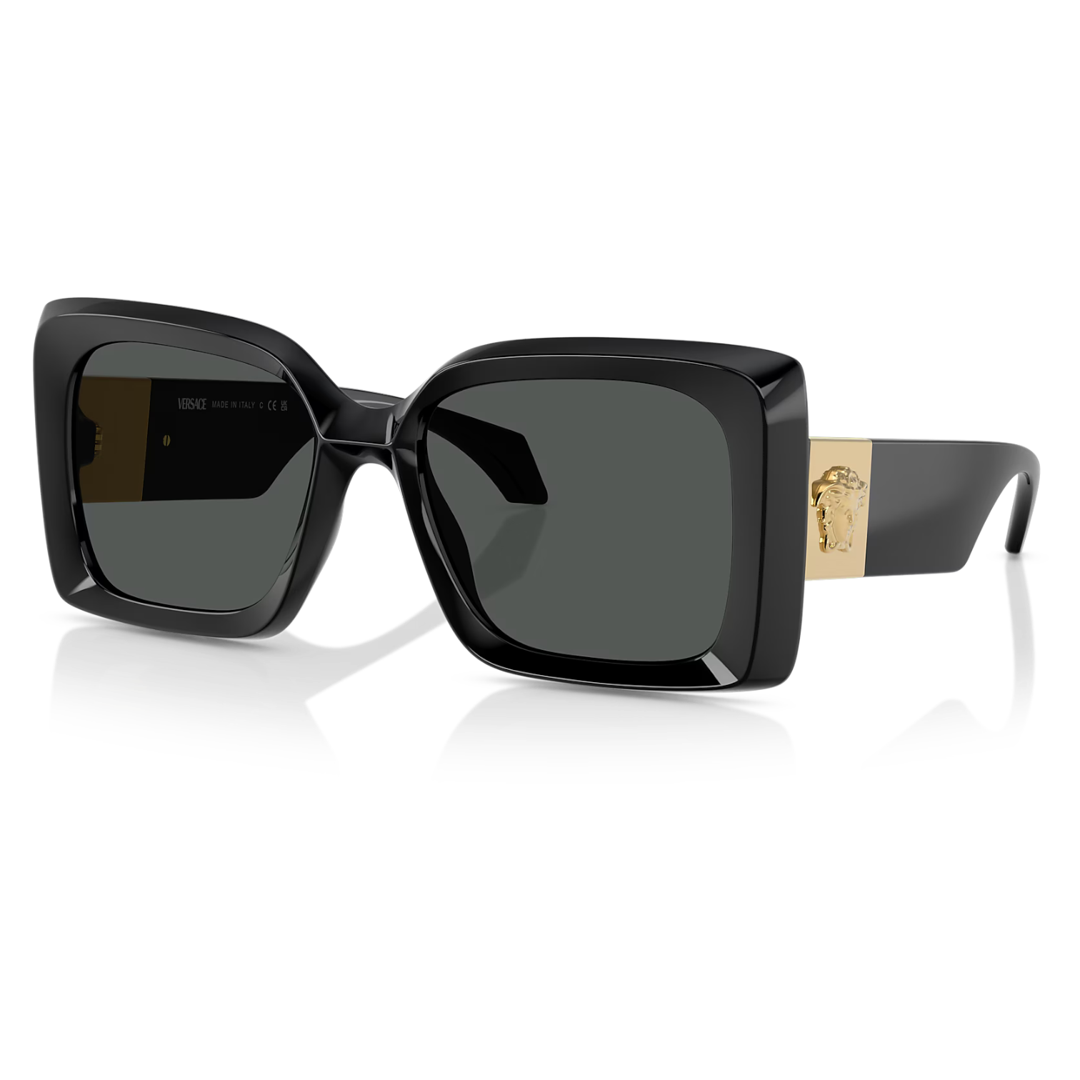 Las gafas de sol Versace VE 4467U en color GB1/87 presentan una montura de acetato negro con forma cuadrada, diseñada para resaltar la elegancia femenina. Las lentes en tono gris oscuro complementan el conjunto, ofreciendo una apariencia sofisticada y atemporal.