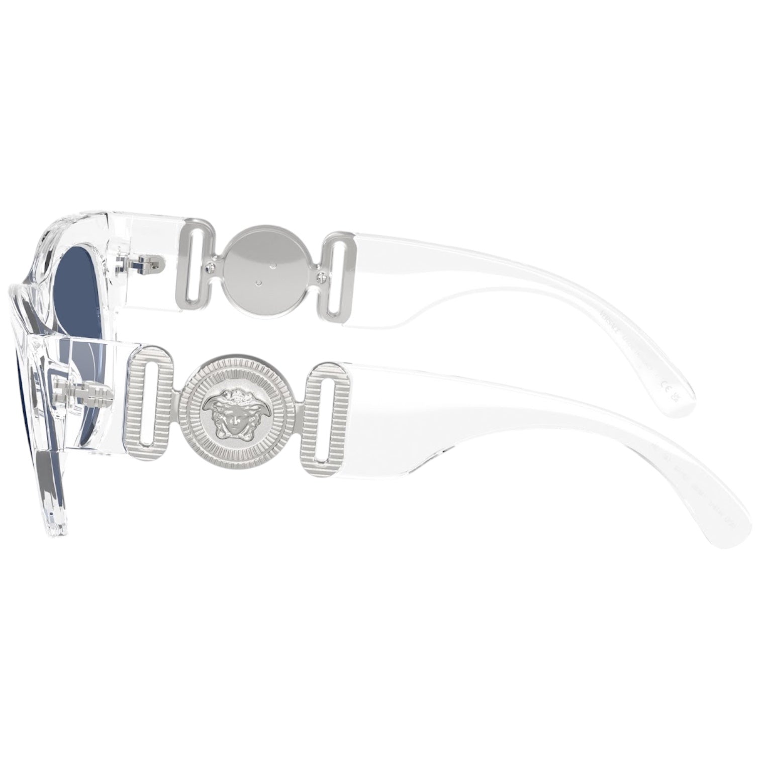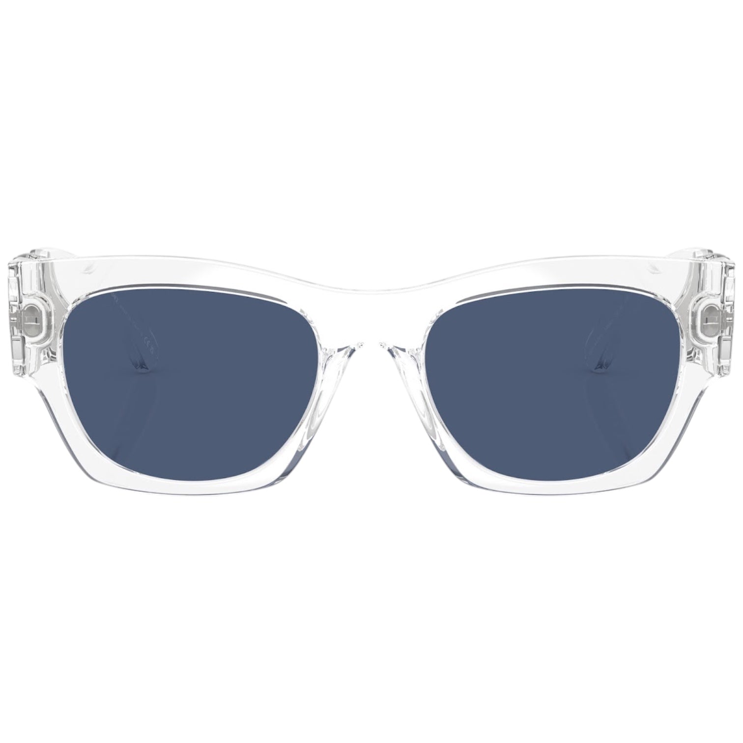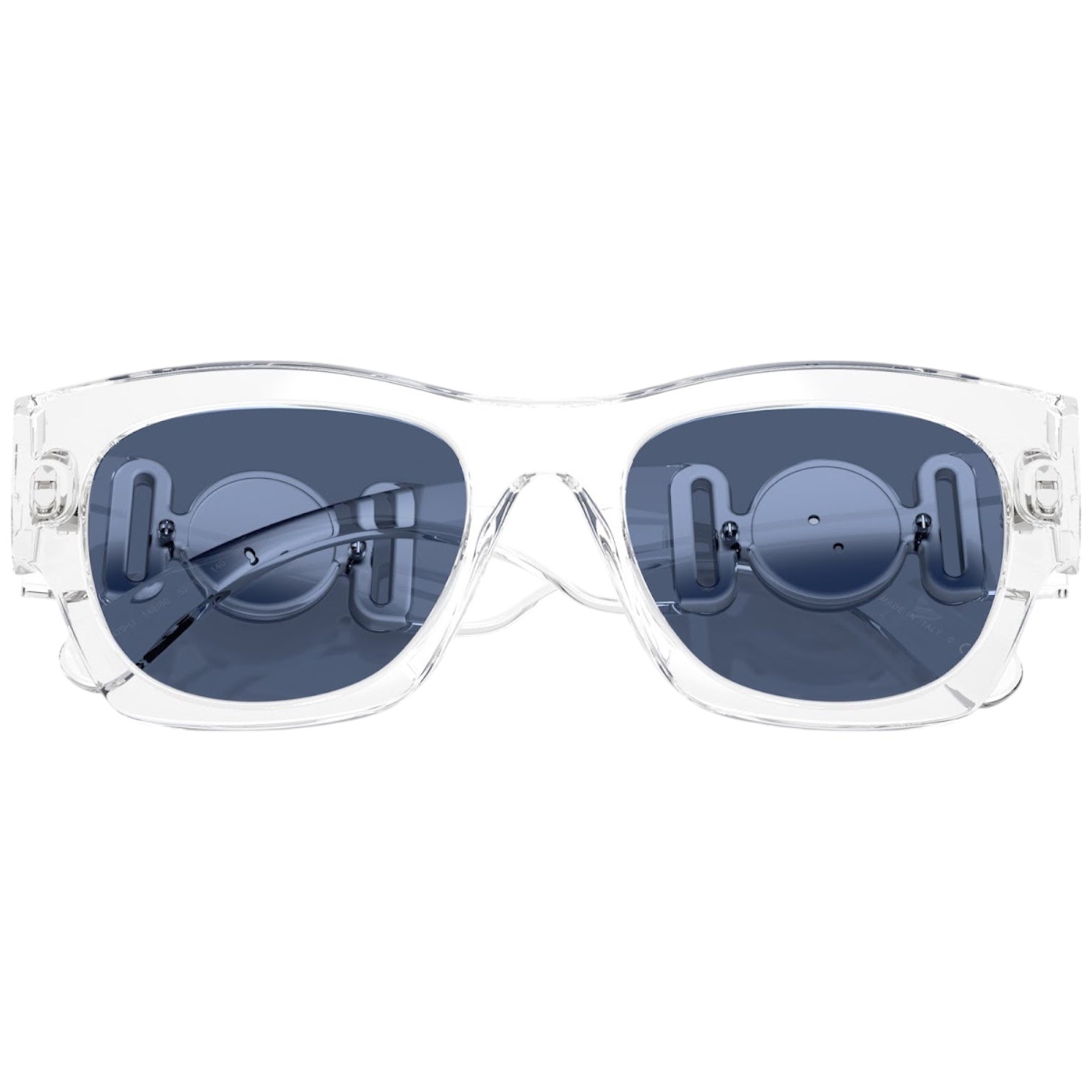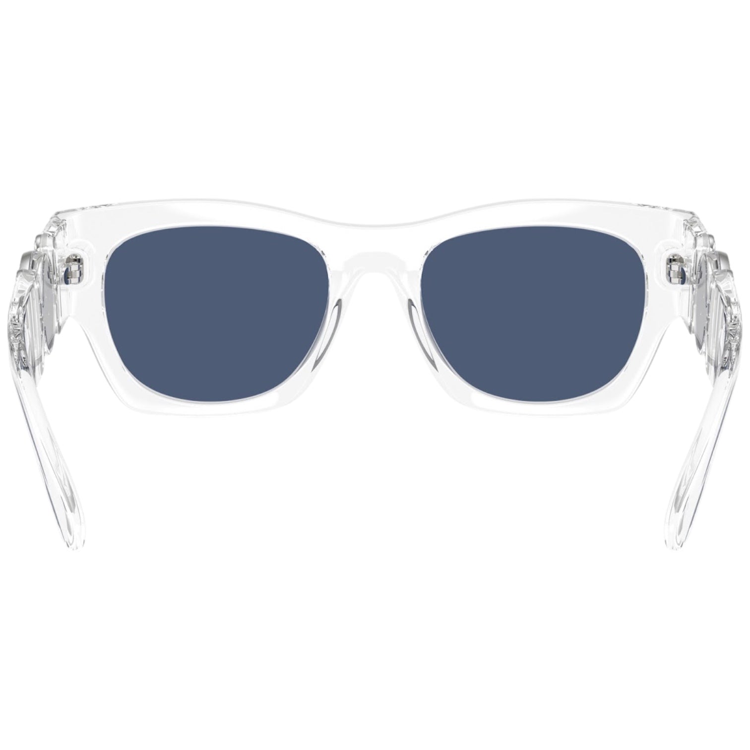 Versace VE 4479U 148/80 – Estas gafas de sol presentan una montura cuadrada de acetato transparente, combinada con varillas en tonos azules que aportan un diseño moderno y distintivo. Las varillas están adornadas con el logotipo dorado de la Medusa, añadiendo un toque de lujo característico de Versace. Equipadas con lentes azules, estas gafas son ideales para quienes buscan una declaración de estilo audaz y sofisticada