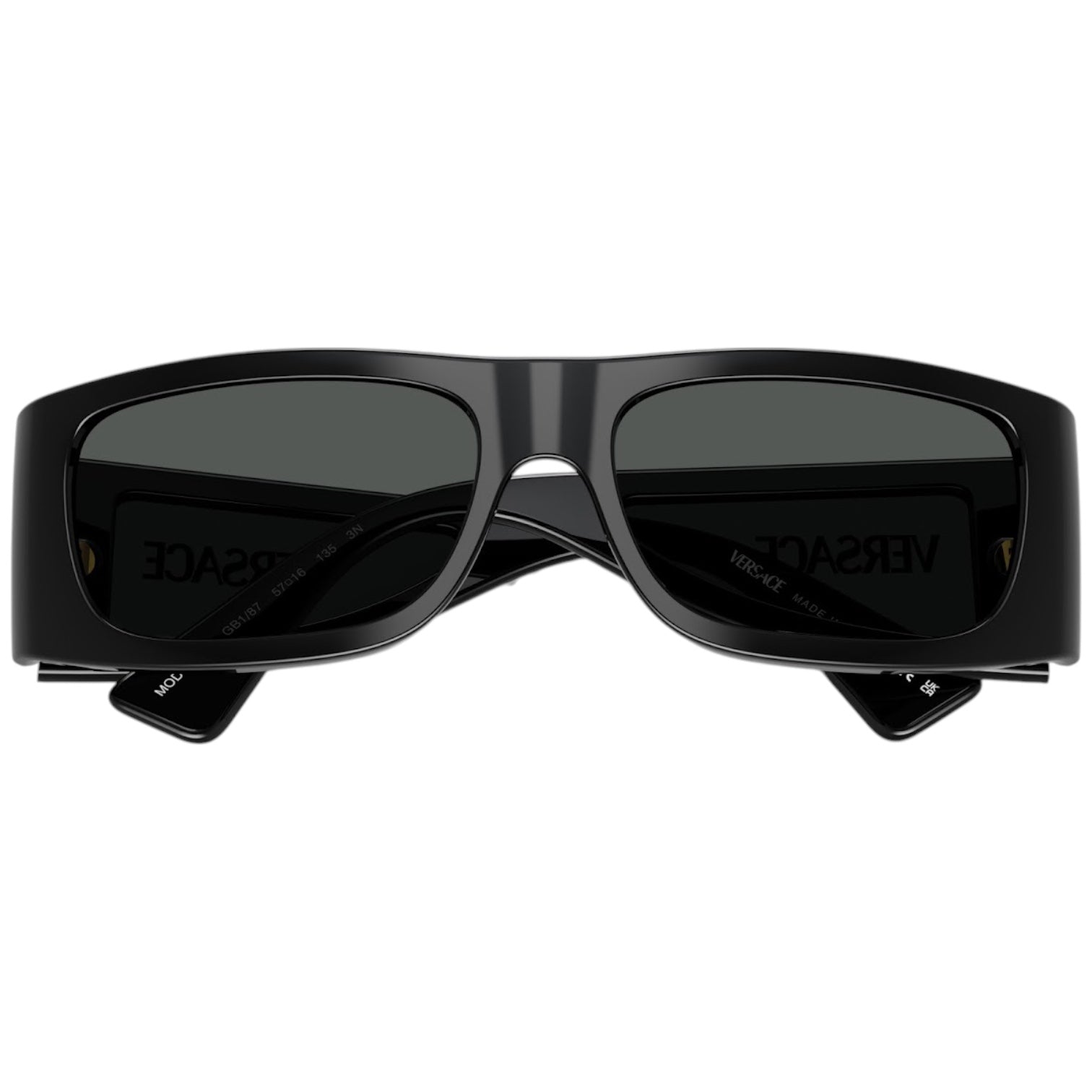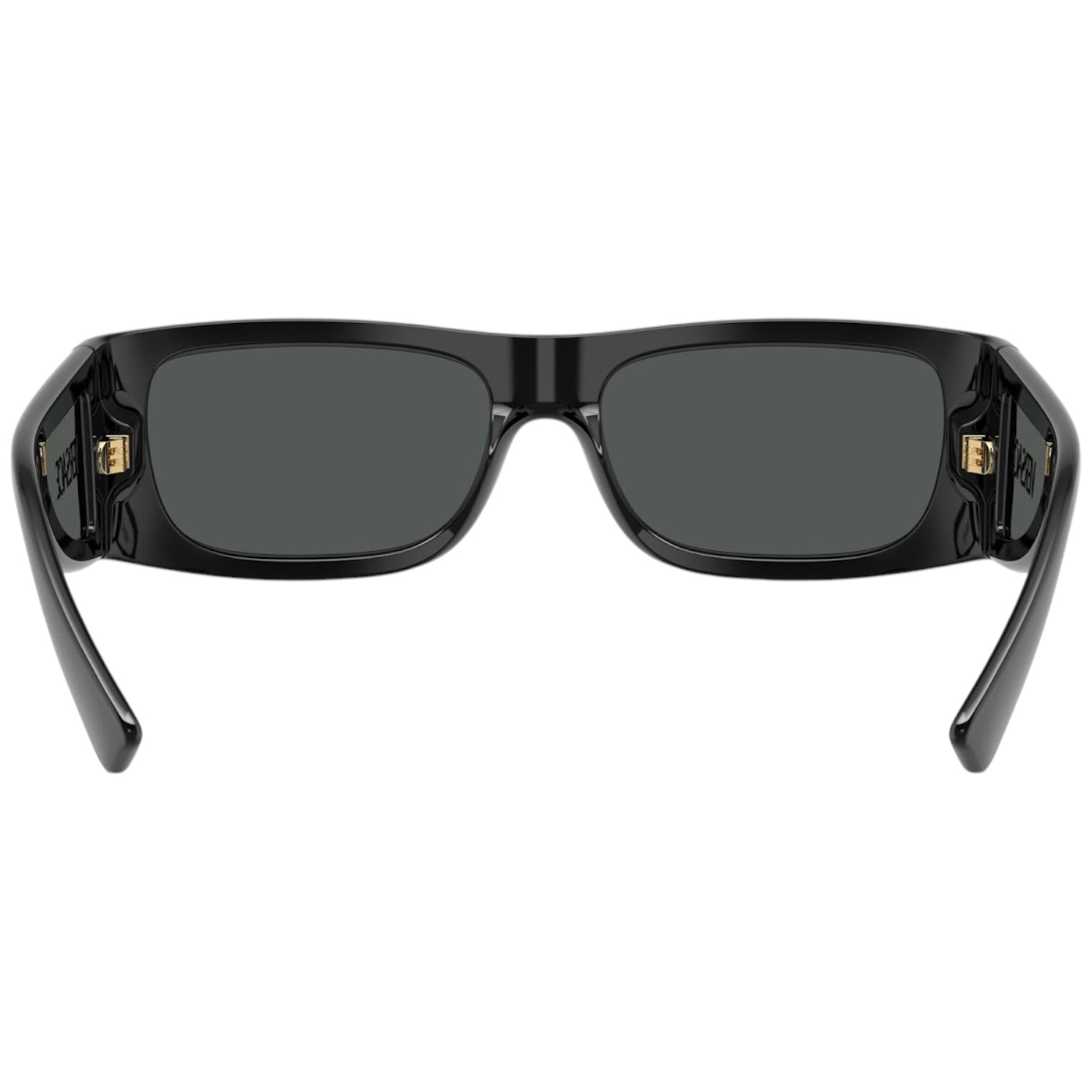 Versace VE 4482 GB1/87 – Estas gafas de sol presentan una montura rectangular de acetato negro, aportando un diseño moderno y sofisticado. Las varillas están adornadas con el logotipo dorado de la Medusa, añadiendo un toque de lujo distintivo. Equipadas con lentes gris oscuro, estas gafas son ideales para quienes buscan una declaración de estilo audaz y elegante.