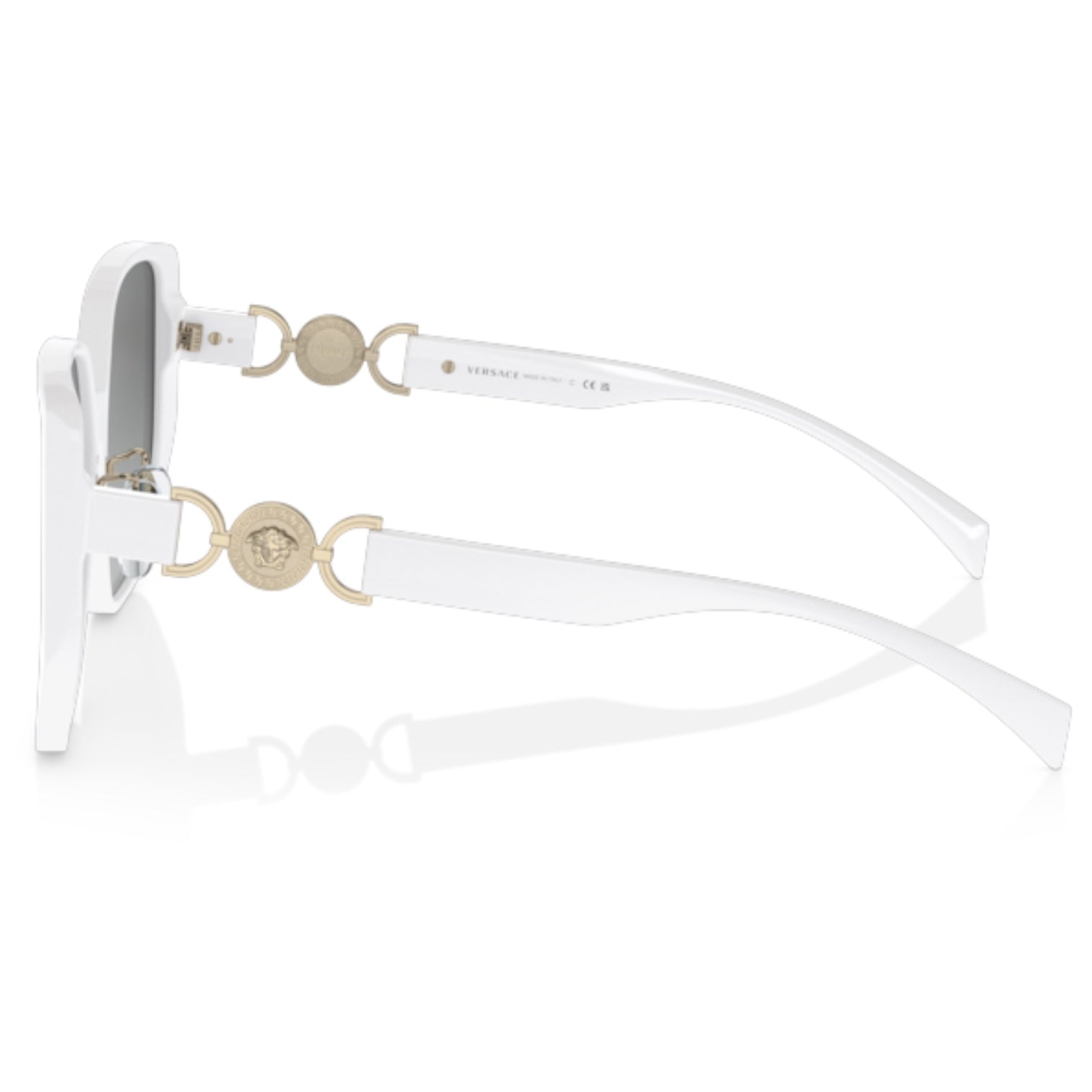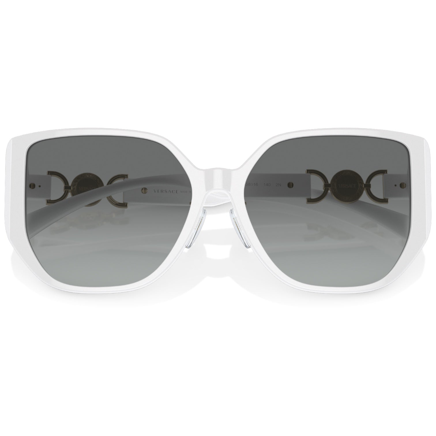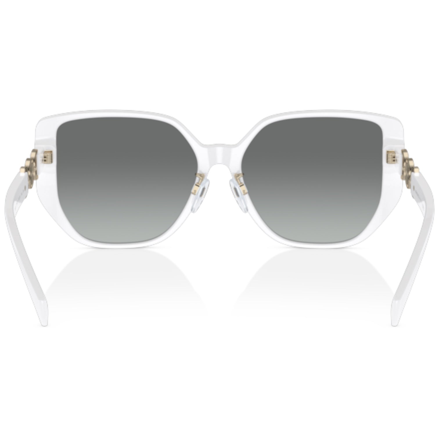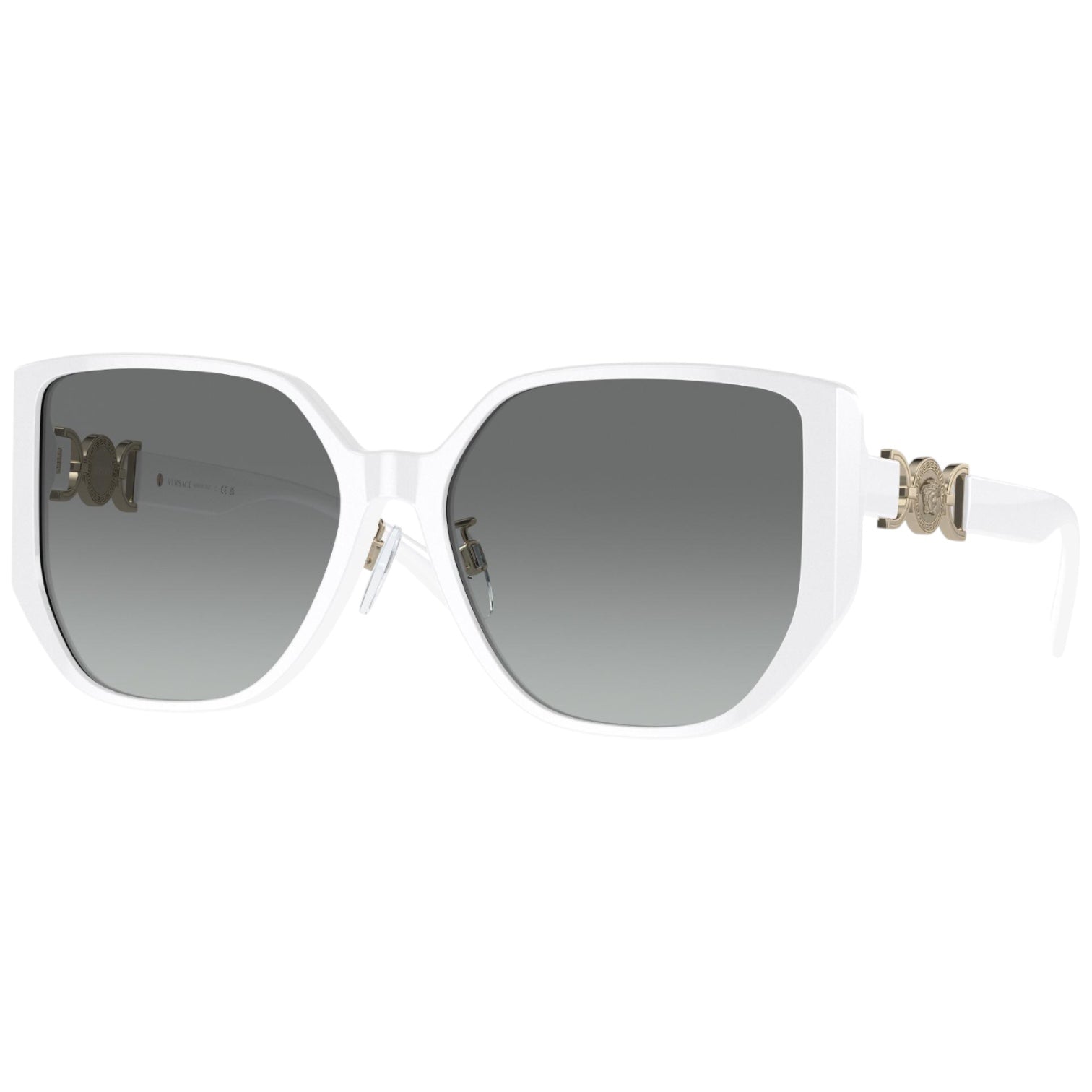 Versace VE4449D 314/11 – Estas gafas de sol presentan una montura cuadrada de acetato blanco, que aporta un diseño moderno y sofisticado. Las varillas, elaboradas en metal, están adornadas con detalles que reflejan la esencia de Versace. Equipadas con lentes de gradiente gris, estas gafas son ideales para quienes buscan una declaración de estilo audaz y elegante